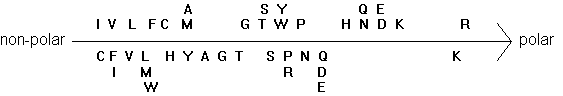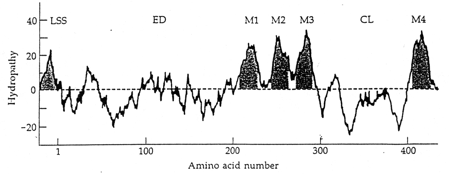 The transmembrane topology of the AChR has been inferred from hydrophobicity analysis and secondary structure prediction of the primary sequence. So called hydropathy plots indicate the grouping of hydrophobic stretches in the sequence that are identified as spanning the membrane, usually in the form of a-helices. Four transmembrane segments have been proposed for the nAChR subunits, and the orientation of the receptor within the post-synaptic membrane has been modeled has having a large N-terminal domain outside the cell facing the synaptic cleft. This is also the location of the agonist binding site in the alpha subunits discussed above. Fig. Two hydrophobicity scales of amino acids