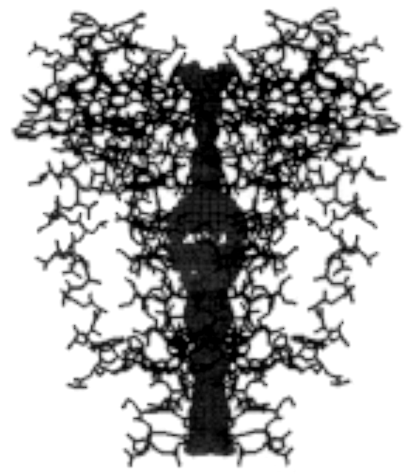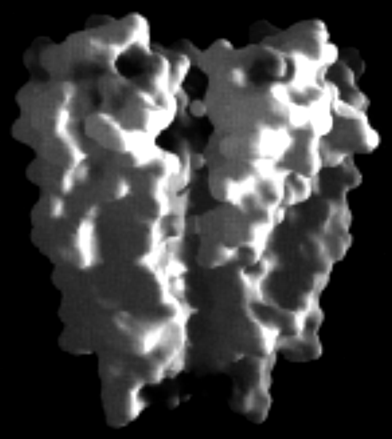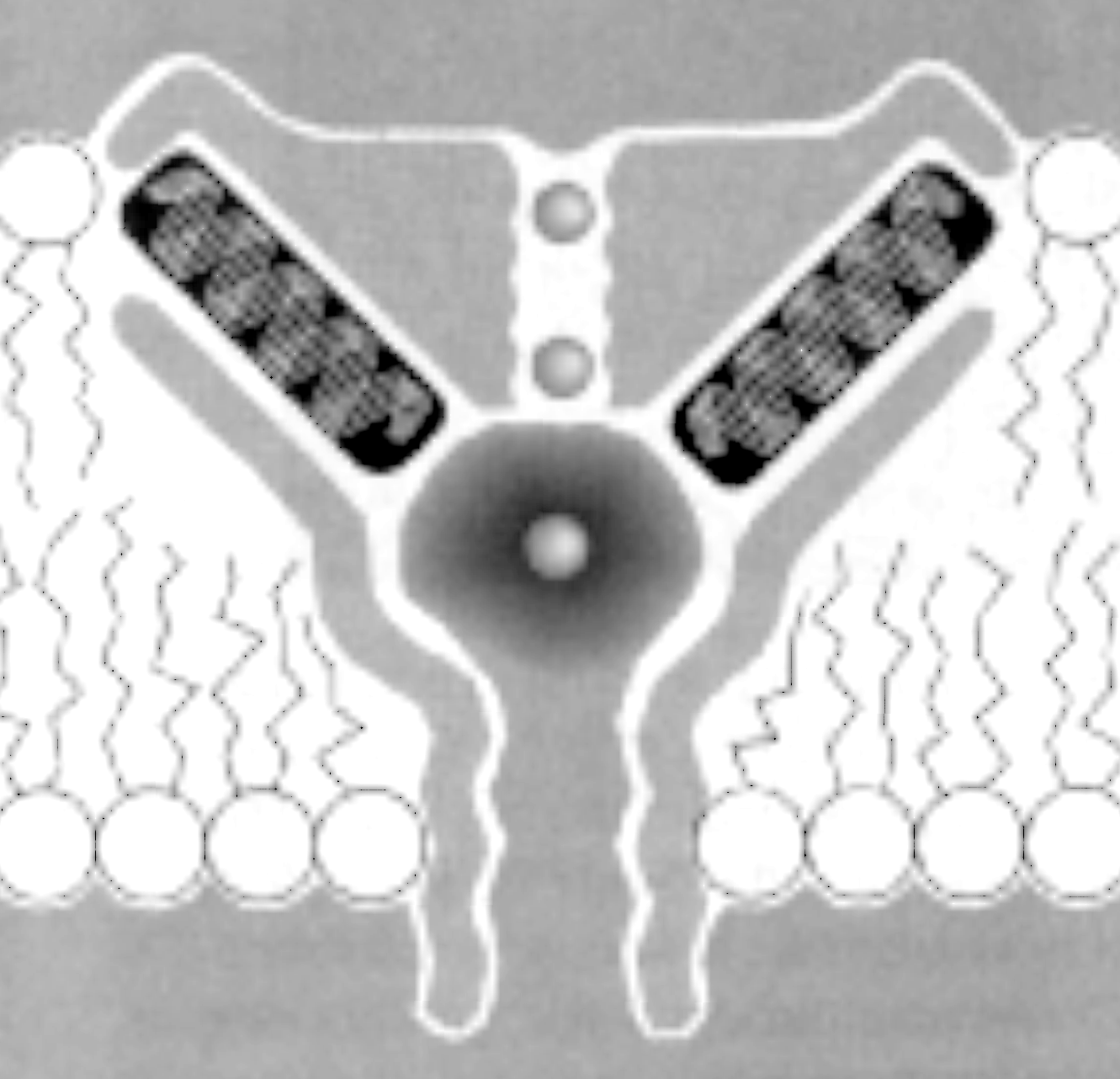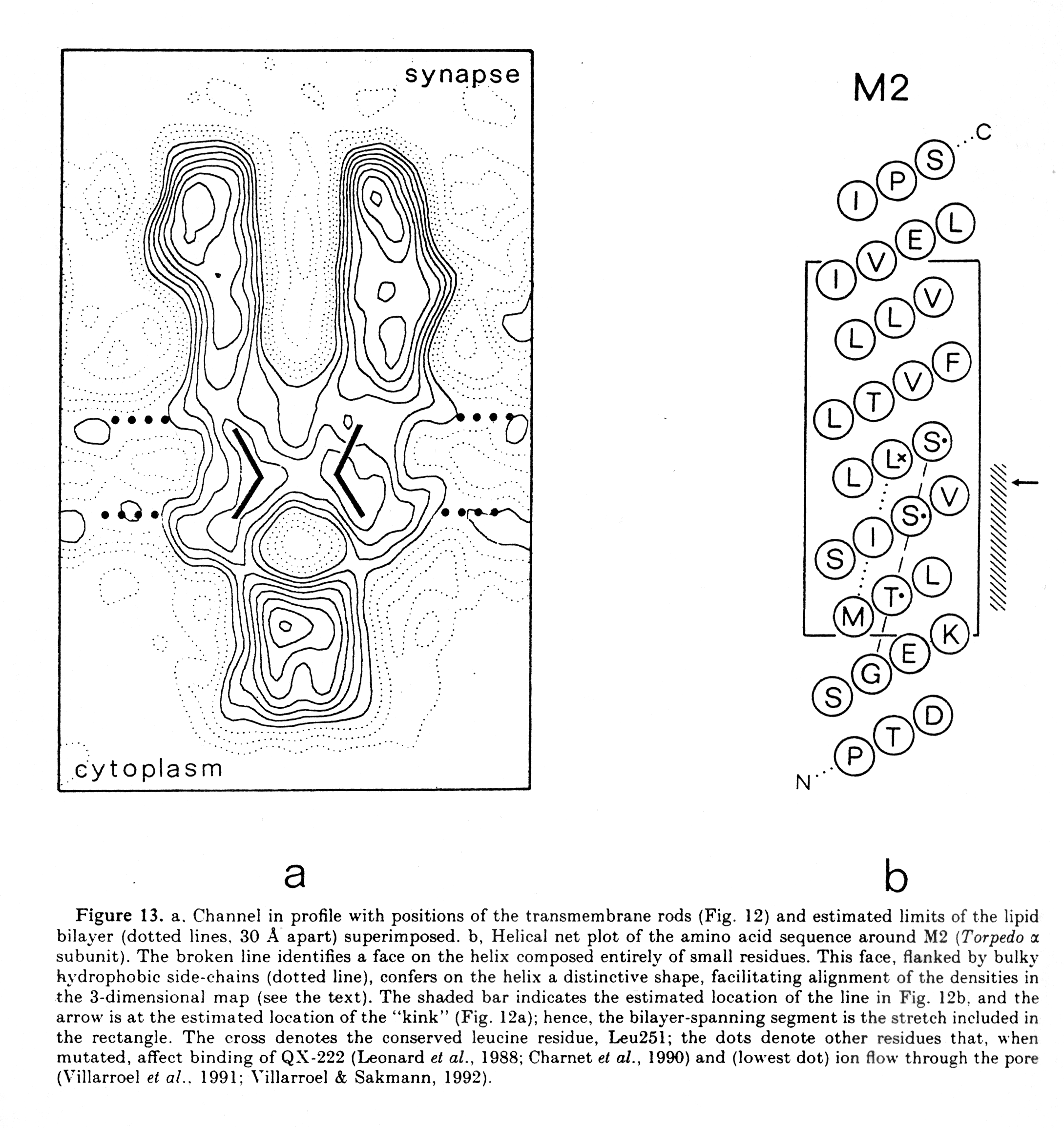 Electron microscopy providing a high resolution of 0.9nm shows the presence of such an a-helix surrounding the central pore. It also shows that the helix is found in a linear form when the channel is open, but exhibits a kink in the middle of the membrane when the channel is closed. A leucine residue in each subunit is located at this kink. The large part of the membrane buried structure, however, does not seem to exhibit any a -helices. It has tentatively been proposed (but not shown) to form a b-barrel structure giving the nAChR pentamer a similar membrane anchoring structure as found in porin trimers.
