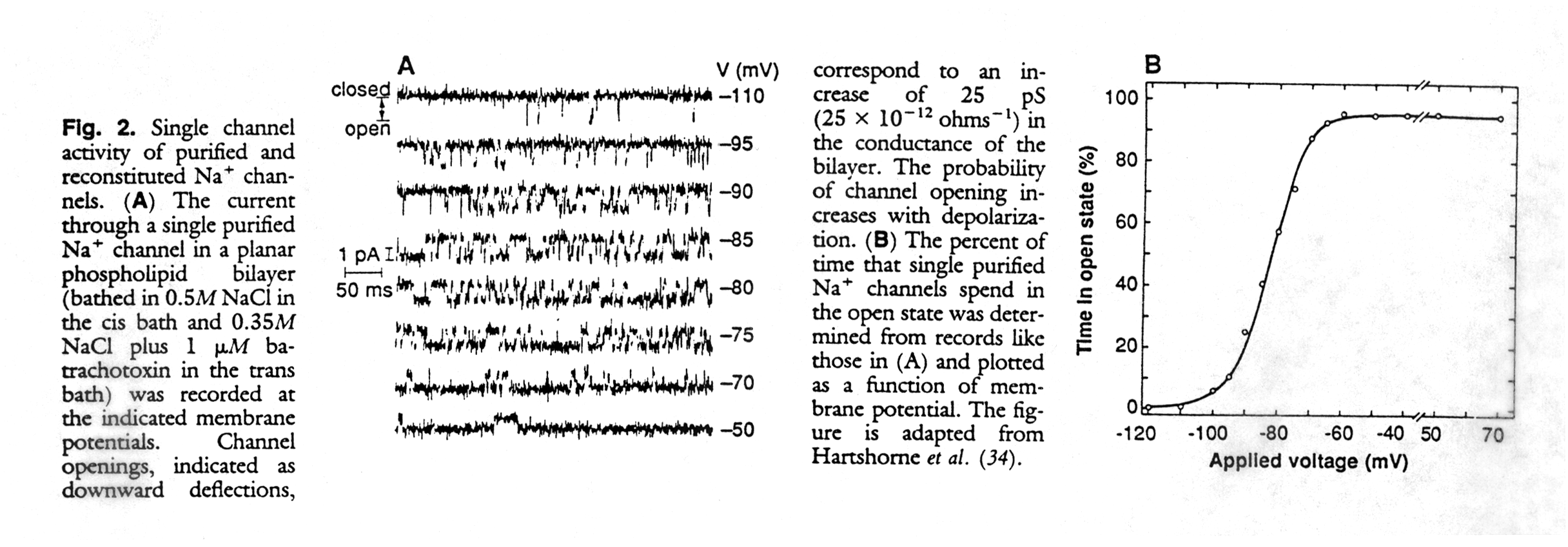 selectivity filter & ion binding sites The crystal structure includes permeating ions (Rb+ or Cs+) and shows three binding sites. One of three cations is stabilized in the middle of the membrane within an aqueous cavity (10 Å diameter) at the negatively charged carboxyl end (helix dipole) of four central a -helices, one from each subunit. Because of the size of the cavity, this central ion is proposed to be hydrated. Furthermore, the structure shows that, with the exception of the selectivity filter (12Å long), the pore lining is mainly hydrophobic (cytoplasmic side of channel lumen, corresponds to lower half of pore in above figure), a general property of K-channels. This might explain why most K-channels have a very high flux rate, or ion conductance. B. Voltage-gated Potassium channels form a family of K+ selective, voltage-gated channels in excitable membranes such as neuronal and muscle cell membranes. So far over 50 different genes have been cloned and sequenced from mammals, plants, and microorganisms. Most potassium channels form homo- or hetero-tetrameric protein complexes with each subunit having 6 transmembrane segments (S1 - S6) and a pore loop structure connecting the fifth and sixth segments. Transmembrane segment S4 contains a series of positively charges amino acids which have been shown to be essential for voltage-sensing. Although the crystal structure of KcsA is a non-voltage-gated type, the sequence similarities of the pore loop strongly suggest that all potassium channels have the same quaternary pore architecture. 6. Measuring single channel activity How are ion channels studied experimentally? Ion channels catalyze the diffusion of ions across membranes with electrical currents in the order of pico Amperes (10-12A). The recording of single channel currents shows two current levels corresponding to the closed and open state respectively. Transitions between these two states are very fast and in the order of fractions of a millisecond, and appear in the recordings as rectangular jumps from one level to the other. The amplitude of the jump corresponds to the current. The current can be normalized and expressed as resistance (or its inverse, the conductance) because it is proportional to the membrane potential as defined by Ohm's law (E = R*I). Channels have ion flux rates of up to 106 ions/second. Normally, the channels stay open for only a fraction of seconds, allowing the flux of tens of thousands of ions through the pore. The activity of the channel can be quantified as open probability, the fraction of time it stays in the open conformation. The open probability of a channel can be compared to the fractional saturation of hemoglobin with molecular oxygen. Whereas in hemoglobin the fractional saturation is related to the saturation pressure of the oxygen (the ligand of the heme), the open probability is related to the concentration of the acetylcholine in the synaptic cleft. Fig. Single channel activity and voltage dependence of a Na-channel (from Catterall, 1988)