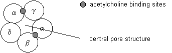 The five subunits are arranged in a circular fashion around a central hole that provides an ion pathway across the post-synaptic cell membrane. The pentameric complex has a five fold pseudo-symmetry because its subunits are not identical. The receptor complex binds two molecules of acetylcholine. Acetylcholine binding induces the opening of the channel. Coupling between the two ACh binding sites and the channel gate is an allosteric mechanism because the binding of a ligand causes a structural change on a distant place in the receptor unit. Fig. Pentameric arrangement of nAChR subunits