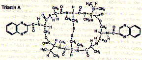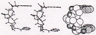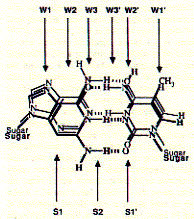 The structure of the antibiotic triostin A shows the presence of two quinoxaline (groups to the right; double aromatic rings) units linked through a cyclic peptide structure (center left) which is stabilized at its center by a cystein pair (disulfhydril covalent bond). Fig. Chemical structure of triostatin A The space filled side view indicates how the two quinoxaline rings are positioned by the linker peptide in co-planar fashion suitable for intercalating with DNA base pairs. As a rule, the more intercalating sidechains are linked within a single ligand structure, the stronger the expected binding affinity. Triostatin A belongs to a family of antibiotics which are characterized by cross-linked octapeptide rings bearing two quinoxaline chromophores. Since the spacing between the chromophores is 3.5A, the intercalation process sandwiches two base pairs between the two quinoxalines. This phenomenon is called bis-intercalation and has first been described for echinomycin by showing that bis-intercalating drugs cause twice the DNA helix extension and unwinding seen as compared to single intercalating molecule like ethidium. The latter is a chromophore which is activated by UV light and is used by molecule biologists to label nucleic acids in gel electrophoresis or ion gradient centrifugation. - role of base pair sequence Fig. Overlap of AT and GC base pairs The following characteristics of non covalent bond formation are associated