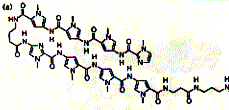 The compound was found to recognize GC base pairs. Solid phase synthesis of polyamides of variable length has produced efficient ligands, e.g. the eight ring hairpin polyamide ImPyPyPy-g-ImPyPyPy-b-Dp (Dp dimethylamino propylamide) shown in the figure above. This small synthetic molecule has an binding constant in the order of 0.03nM. The optimal goal of polyamide ligand design has been reached with finding structures able to recognize DNA sequences of specific genes. The structure shown above inhibits the expression of 5S RNA in fibroblast cells (skin cancer cells) by interfering with the transcription factor IIIA-binding site. A new strategy of rational drug design exploits the combination of polyamides with bis-intercalating structures. WP631 is a dimeric analog of the clinically proven anthracycline antibiotic daunorobuicin. Fig. Structure of WP631 This new synthetic compound shows an affinity of 10pM and also showed